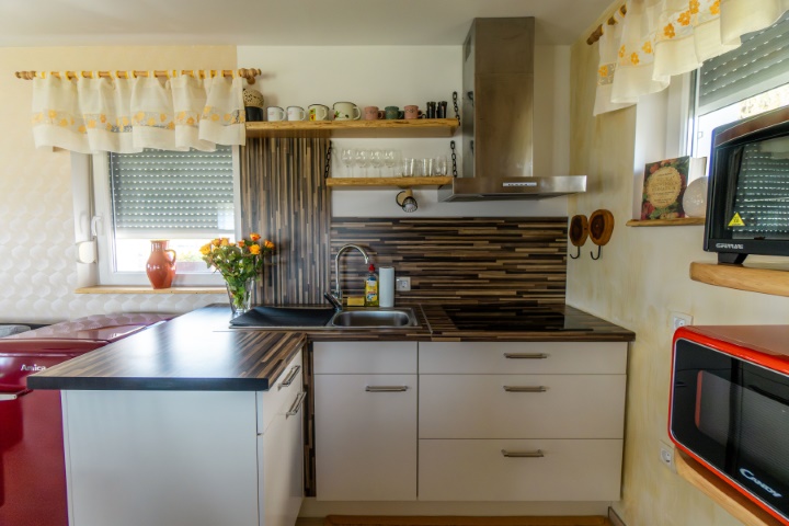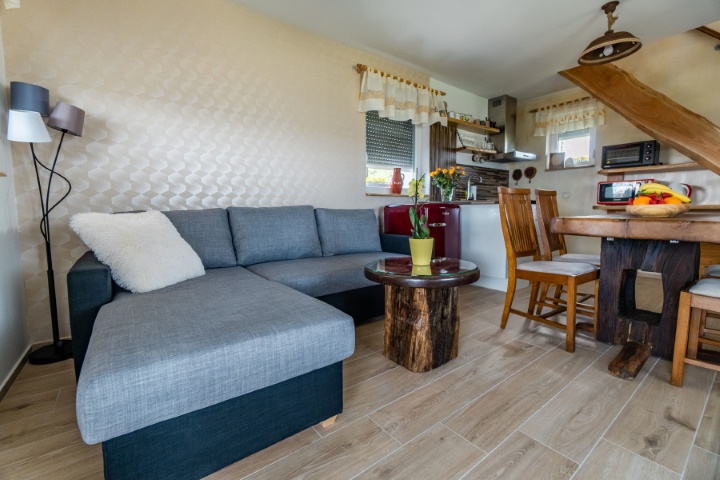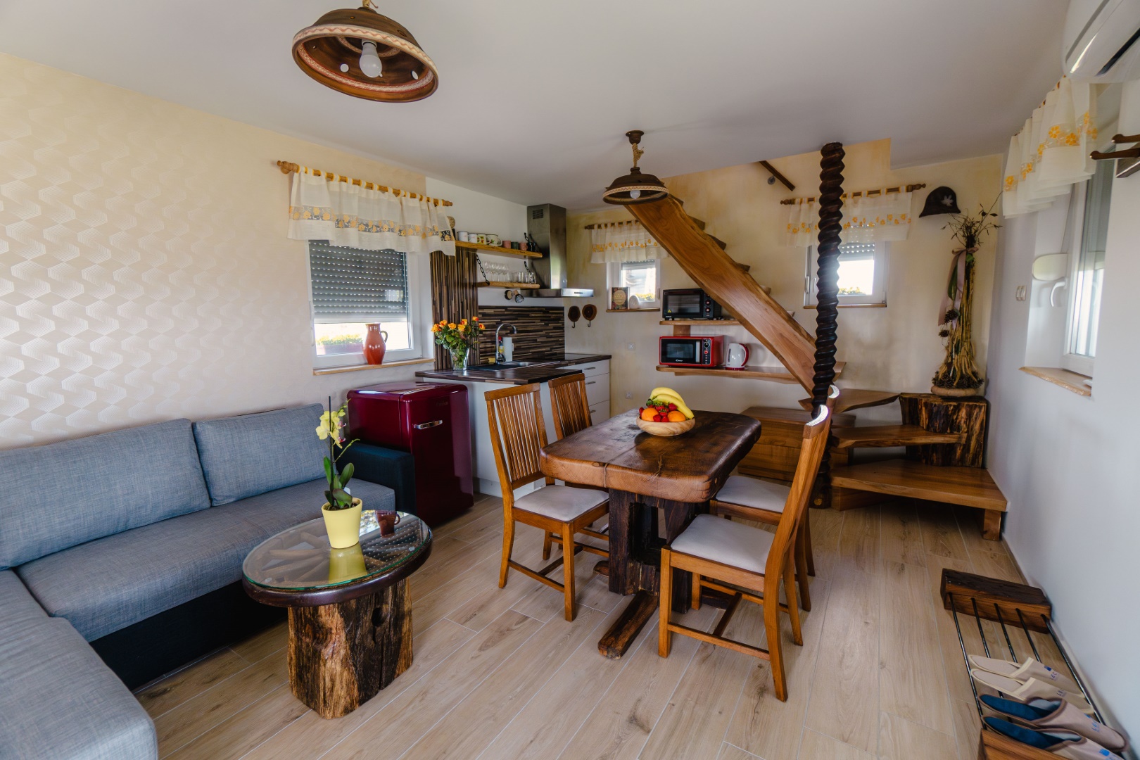 V popolnoma opremljeni kuhinji si pripravite zajtrk, skuhate kavo in že uživate na urejeni zelenici ali na terasi, kjer vas čaka gugalnica za dva.
