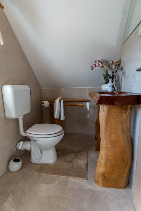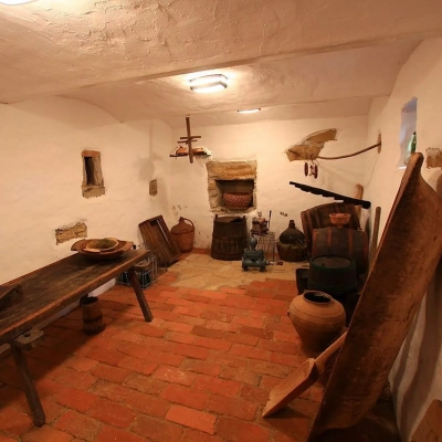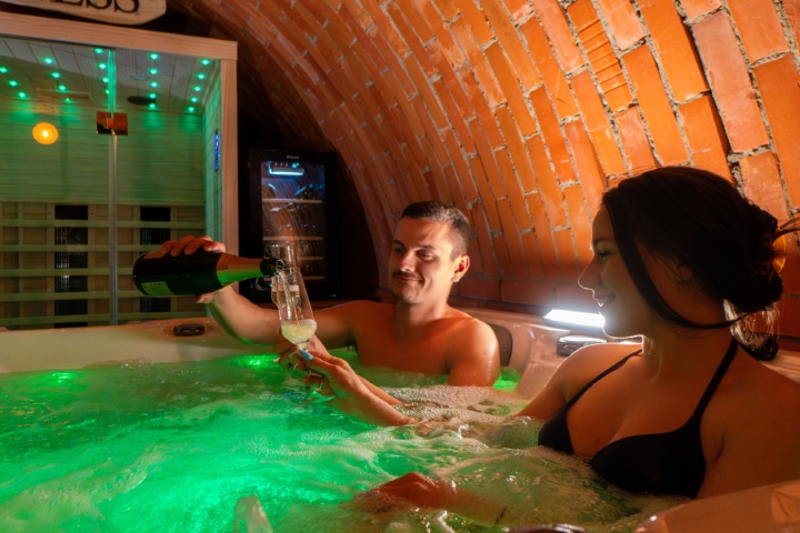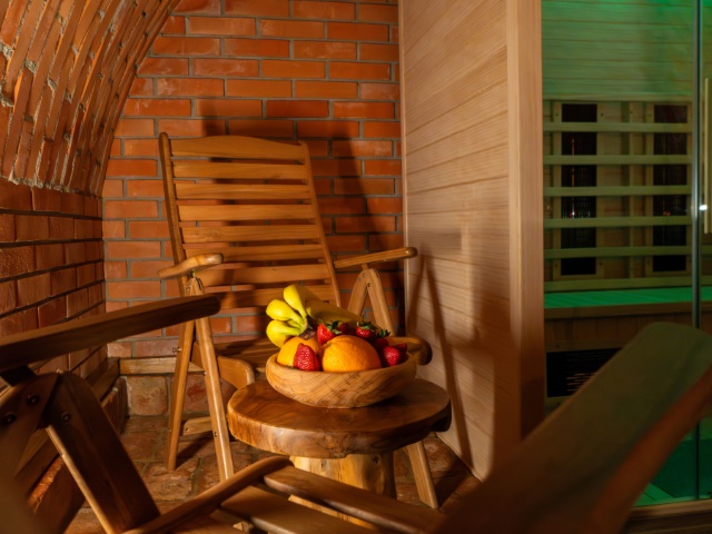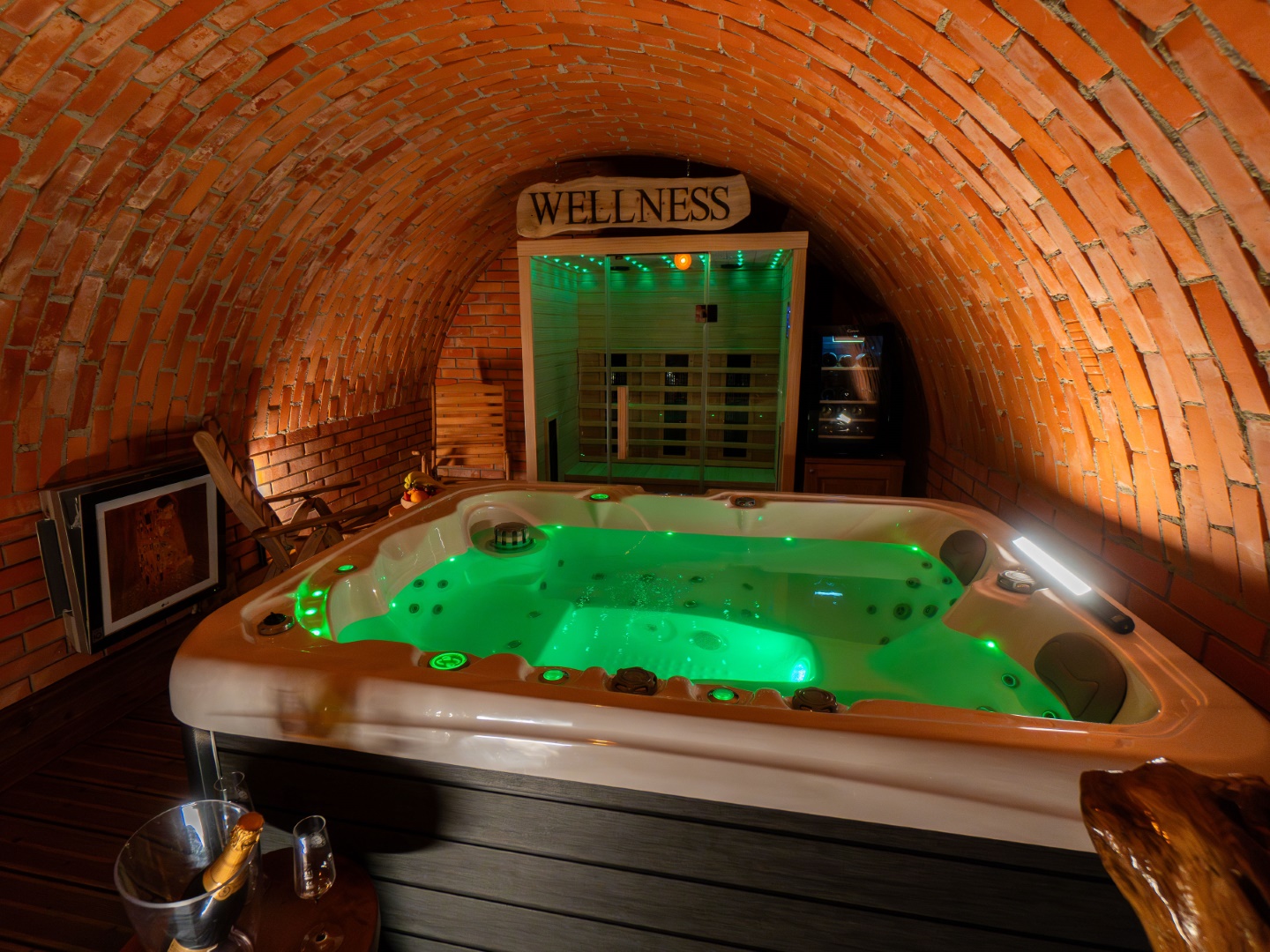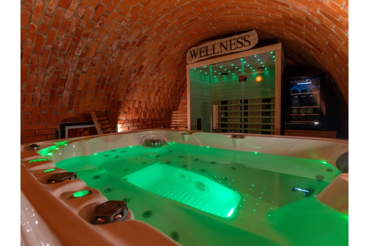 Ko odprete velika lesena vrata, ki vodijo v kletne prostore objekta, vas čaka prostor za razvajanje – stara velbana opečna klet z lesenih podom - Wellness.