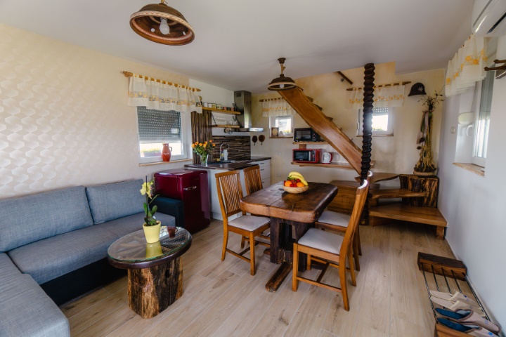 V primeru slabega vremena pa kar v notranjosti – na mizi, narejeni iz lesa stare preše, udobni sedežni garnituri, pred TV ekranom, s svojim Wi-fi jem.